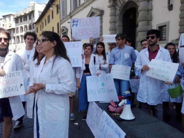Vedere quei ragazzi in camice bianco davanti alla sede della presidenza della Regione, in piazza Duomo, a Firenze, con i cartelli contro il ministro dell’Università, provoca rabbia. Quei ragazzi, giovani ma già professionisti, chiedono una cosa sola: fateci lavorare nel modo giusto, non per essere compensati con crediti formtivi. Questo nel momento in cui il Paese sta soffrendo. E nel momento in cui si chiede ai medici in pensione, magari intimoriti dal Covid, di tornare nei reparti degli ospedali. Fateci lavorare nel modo giusto, gridano e scrivono quei ragazzi.