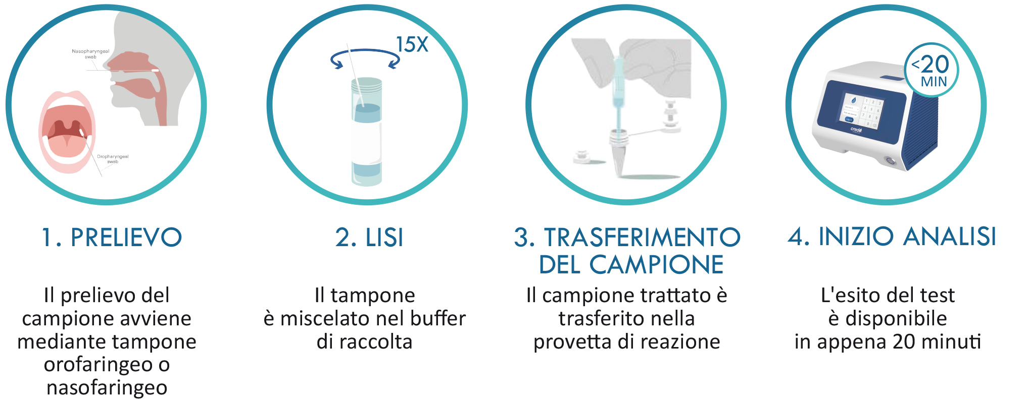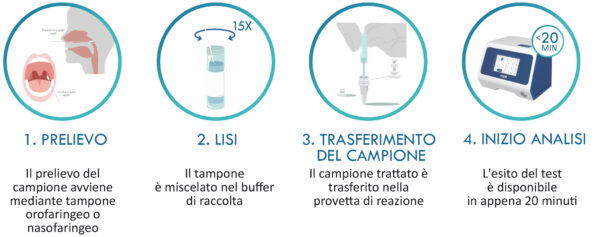 Una volta prelevato con un tampone naso o orofaringeo, da personale sanitario, il campione viene inserito in un flaconcino contenente un liquido, e agitato. Il suo contenuto verrà quindi versato in un altro flaconcino, contenente il reagente che, una volta richiuso, verrà inserito all’interno del sistema VitaPCR™, avviando il processo di analisi. Entro 20 minuti lo strumento rilascia il risultato sul proprio schermo, indicando negatività o positività per Covid-19, influenza A e influenza B.
