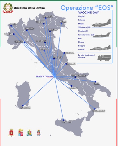 Le dosi sono state prima stoccate presso l’ospedale Spallanzani di Roma e poi distribuite nelle altre Regioni per consentire all’intero Paese di partecipare, domenica 27 dicembre, al “Vaccine day europeo”. Dall’Ospedale Spallanzani, una parte dei vaccini sarà trasportata a Pratica di Mare dove 5 aerei (due C27J dell’Aeronautica, due Dornier Do. 228 dell’Esercito e un P-180 della Marina) raggiungeranno le mete più lontane. I restanti vaccini raggiungeranno le destinazioni via terra con un impegno complessivo di 60 autoveicoli e circa 250 militari. Nella cartina sottostante manca una destinazione per la Basilicata.