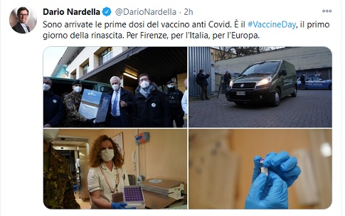 FIRENZE – Non poteva mancare, nella passerella dei politici nazionali e locali, l’annuncio del sindaco Nardella, esultante per l’arrivo delle prime dosi e per le prime vaccinazioni a Careggi. Il sindaco dichiara, postando le foto dell’avvenimento: «Sono arrivate le prime dosi del vaccino anti Covid: È il #Vaccine-Day, il primo giorno della rinascita. Per Firenze, per l’Italia, per l’Europa».