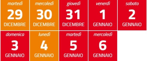 Il 28, 29 e 30 dicembre 2020 e il 4 gennaio 2021 sono invece zona arancione. In zona arancione è possibile spostarsi all’interno del proprio Comune, senza necessità di autocertificazione, tra le ore 5 e le 22 ovviamente, quando scatta invece il coprifuoco durante il quale è possibile spostarsi solo per motivi di lavoro, urgenza e salute (motivati con autocertificazione). Rimane il divieto di spostamento tra le Regioni, tranne che per i motivi precedentemente elencati (comprovate esigenze, rientro a casa). Per i comuni con popolazione inferiore ai 5.000 abitanti è permesso spostarsi anche fuori dal proprio comune in un raggio di 30 Km, ma non si può andare nei capoluoghi di provincia. Rimane il divieto di assembramento, l’obbligo di mascherina e di distanziamento. Si può uscire per fare una passeggiata o per fare attività motoria dalle 5 alle 22. I negozi sono aperti fino alle 21, i centri commerciali sono chiusi nei giorni festivi e prefestivi. Le attività dei servizi di ristorazione come bar, pub, ristoranti, gelaterie, pasticcerie rimangono chiuse. Sono aperte solo per la consegna a domicilio (senza limiti di orario) e per l’asporto (fino alle 22). Vietata la consumazione sul posto.