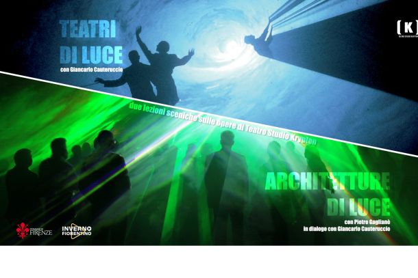 ARCHITETTURE DI LUCE. Videolezione scenica. Il critico e curatore Pietro Gaglianò dialoga con Giancarlo Cauteruccio in questo video filmato da Cesare Baccheschi. L’artista e il critico ,entrambi provenienti da studi di architettura, analizzano il percorso di Krypton dagli anni Ottanta a oggi attraverso immagini e video dagli archivi della compagnia. Le numerose opere di Teatro/Architettura prodotte nel tempo costituiscono il supporto per raccontare, in particolare ai giovani, una realtà artistica che ancora oggi prosegue con successo il suo iter poetico e progettuale . Gaglianò e Cauteruccio prendono in esame il lavoro di ricerca sullo spazio urbano e sull’architettura, un’esperienza che continua in parallelo alla creazione di opere per il palcoscenico. Si tratta di un terreno di indagine da cui origina per il regista il percorso per sviluppare l’idea di un Teatro dei Luoghi, che egli ha posto al centro della sua ricerca per attivare azioni d’arte nella città contemporanea. Come scrive Pietro Gagliano nel suo libro «Architetture di Luce», “Condizioni fisiche, ma soprattutto temporali, fanno del teatro architettura un’esperienza diversa dal lavoro in palcoscenico, più vicina a quella delle arti visive, un vero e proprio incrocio di discipline e arti. Il teatro di Krypton è sempre architettura, intesa come proiezione di uno spazio, di quell’alchimia che trasforma l’idea in disegno bidimensionale, e il disegno in spazio abitabile, percorribile. Al tempo stesso le opere di Teatro Architettura contengono, irriducibile, il meccanismo propulsore del teatro e ne condividono processi e strumenti, essendo, negli esiti formali, spettacolo teatrale allo stato puro”.