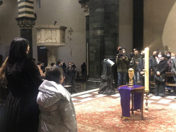 PRATO – Una cerimonia semplice e composta, voluta dalla famiglia, in particolare dalla moglie, per permettere anche a Prato, sua città natale, di dare l’ultimo saluto al suo campione, Paolo Rossi. A distanza di 18 giorni dai funerali nel Duomo di Vicenza, la Cattedrale di Santo Stefano ha accolto oggi pomeriggio le ceneri di Pablito racchiuse all’interno di un’urna a forma di Coppa del Mondo per la commemorazione esequiale celebrata durante la santa messa dal vescovo di Prato, monsignore Giovanni Nerbini. Presenti in Duomo – nel rispetto delle normative anticontagio – i familiari del campione del Mundial di Spagna ’82, con il fratello Rossano, la moglie Federica e i figli; i rappresentanti delle istituzioni con il sindaco Matteo Biffoni in prima fila; amici ed ex compagni di Paolo Rossi, tra i quali Giovanni Galli e Giancarlo Antognoni; cittadini e tifosi. Tante le persone presenti anche in piazza Duomo per l’omaggio simbolico a Paolo Rossi. La commemorazione è stata trasmessa in diretta televisiva su Tv Prato.