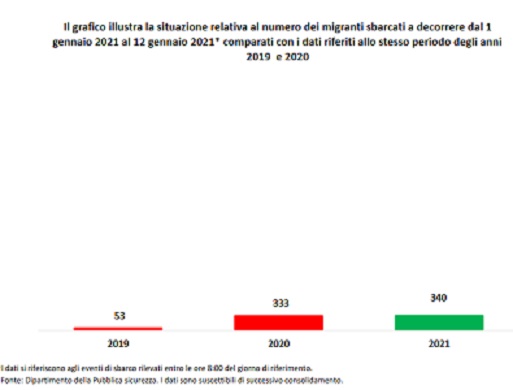 Nelle due figure soprastanti, pubblicate sul cruscotto giornaliero del Ministero dell’interno, emerge che nel 2019, nel periodo indicato, ci sono stati solo 53 sbarchi, moltiplicati per 7 nel 2020 (333) e addirittura aumentati nel 2021 (340). A quest’ultima cifra si arriva grazie allo sbarco monstre effettuato dalla Open Arms che ha raccattato nel mediterraneo 265 presunti naufraghi di due imbarcazioni in presunta difficoltà. Come al solito i cosiddetti naufraghi naturalmente non potevano restare a lungo nell’imbarcazione della Ong, viste le condizioni meteo, del mare e quelle sanitarie, occorreva sbarcarli al più presto e naturalmente in Sicilia.
