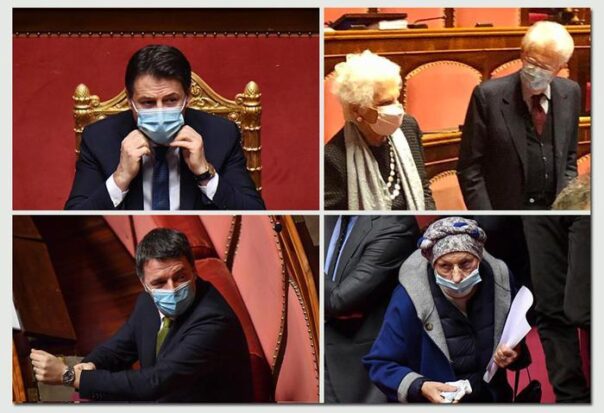Nelle foto Ansa, in alto da sinistra: il premier Giuseppe Conte; Liliana Segre e Mario Monti; Matteo Renzi; Emma Bonino