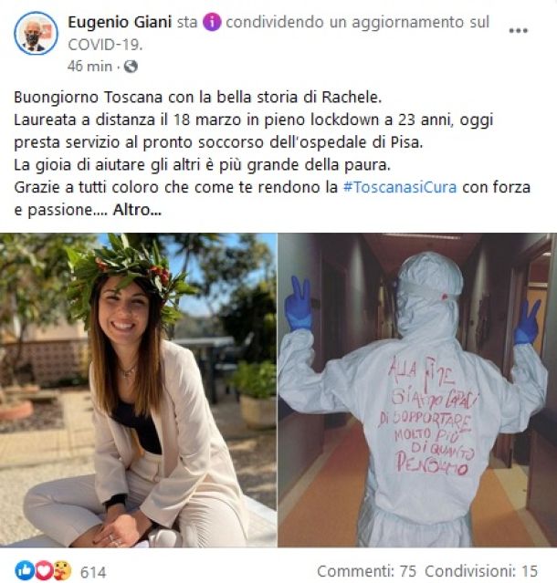 FIRENZE – I nuovi casi positivi registrati in Toscana sono 594 su 17.000 test di cui 10.028 tamponi molecolari e 6.972 test rapidi. Il tasso dei nuovi positivi è 3,49%. Lo annuncia su Facebook il presidente della Toscana, Eugenio Giani, anticipando il dato del bollettino regionale sull’andamento dell’epidemia di coronavirus. Nel post Giani pubblica la foto di una giovane neolaureata e scrive: «Laureata a distanza il 18 marzo in pieno lockdown a 23 anni, oggi presta servizio al pronto soccorso dell’ospedale di Pisa. La gioia di aiutare gli altri è più grande della paura. Grazie a tutti coloro che come te rendono la #ToscanasiCura con forza e passione».