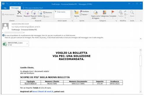 FIRENZE – A seguito di nuove segnalazioni in merito a comunicazioni dal contenuto ingannevole, inviate da un indirizzo email solo all’apparenza riferito ad una società del Gruppo Enel, l’azienda torna a fornire le raccomandazioni del caso, precisando di aver già avviato tutte le azioni necessarie per la tutela dei clienti e delle società del Gruppo. In questo caso si tratta di una e-mail dal contenuto ingannevole che sfrutta il brand Enel, di seguito l’esempio di email truffa, che riporta come oggetto Enel Energia – >Emissione Bolletta PEC.