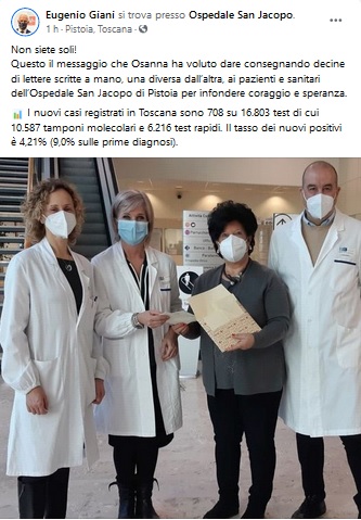 FIRENZE – I nuovi casi registrati in Toscana sono 708 su 16.803 test di cui 10.587 tamponi molecolari e 6.216 test rapidi. Il tasso dei nuovi positivi è 4,21% (9,0% sulle prime diagnosi). Lo annuncia su Facebook il presidente della Toscana, Eugenio Giani, anticipando il dato del bollettino regionale sull’andamento dell’epidemia di coronavirus. Poi Giani aggiunge al post una storia sulla lotta al Covid che arriva dalla Toscana. In particolare, il governatore racconta ciò che è accaduto all’ospedale di Pistoia e scrive: Non siete soli! Questo il messaggio che Osanna ha voluto dare consegnando decine di lettere scritte a mano, una diversa dall’altra, ai pazienti e sanitari dell’ospedale San Jacopo di Pistoia per infondere coraggio e speranza.