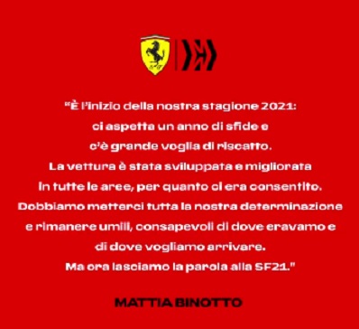 Come gia’ anticipato da Binotto, quest’anno la presentazione di squadra e vettura sara’ articolata in due eventi online separati, rispettivamente il 26 febbraio e il 10 marzo.