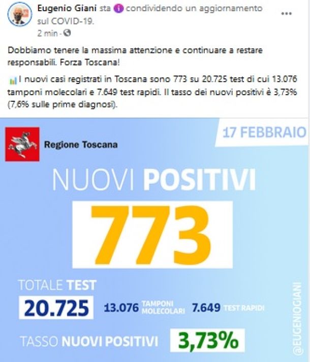 FIRENZE – Ecco la consueta anticipazione dei dati sul coronavirus in Toscana per il giorno 17 febbraio, pubblicati dal Presidente Giani sulla sua pagina Facebook: «Dobbiamo tenere la massima attenzione e continuare a restare responsabili. Forza Toscana! I nuovi casi registrati in Toscana sono 773 su 20.725 test di cui 13.076 tamponi molecolari e 7.649 test rapidi. Il tasso dei nuovi positivi è 3,73% (7,6% sulle prime diagnosi)».