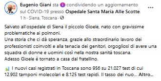 FIRENZE – Dalla pagina Facebook del Presidente Giani: «Salvato all’ospedale di Siena il piccolo Gioele, nato con gravissime problematiche ai polmoni. Una storia che ci dà speranza, grazie allo straordinario lavoro dei professionisti coinvolti e alla tenacia dei genitori, orgogliosi di avere una squadra di donne e uomini così nella nostra sanità toscana. Adesso Gioele è tornato a casa dal fratellino».