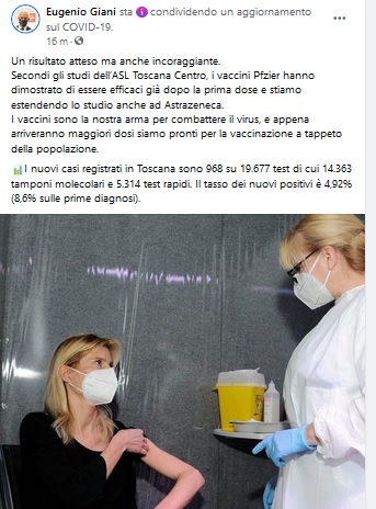 FIRENZE – I nuovi casi registrati in Toscana sono 968 su 19.677 test di cui 14.363 tamponi molecolari e 5.314 test rapidi. Il tasso dei nuovi positivi è 4,92% (8,6% sulle prime diagnosi). Lo anticipa su Facebook il governatore Eugenio Giani, che aggiunge, in merito alle vaccinazioni: «Un risultato atteso ma anche incoraggiante. Secondi gli studi dell’ASL Toscana Centro, i vaccini Pfzier hanno dimostrato di essere efficaci già dopo la prima dose e stiamo estendendo lo studio anche ad Astrazeneca. I vaccini sono la nostra arma per combattere il virus, e appena arriveranno maggiori dosi siamo pronti per la vaccinazione a tappeto della popolazione»