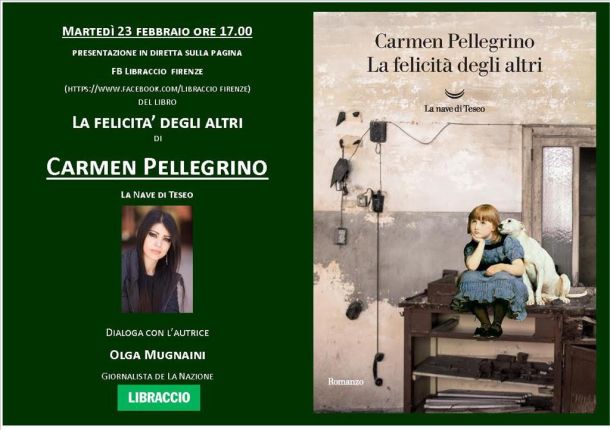 FIRENZE – Martedì 23 febbraio alle 17 Carmen Pellegrino, autrice di «La felicità degli altri» (La nave di Teseo, Milano 2021, euro 18, pagine 242), sarà in diretta sulla pagina Facebook Il Libraccio Firenze a dialogare del suo nuovo libro con Olga Mugnaini, giornalista de La Nazione.
