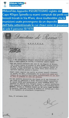 Se il documento fosse autentico, qualche interrogativo me lo porrei da subito. I bossoli rinvenuti in via Fani proverrebbero da un deposito dell’Italia settentrionale, le cui chiavi erano in possesso di sole sei persone. Sarebbe interessante sapere a chi appartenesse il deposito e chi fossero le sei persone, ma temo che sarà difficile arrivare alla spiegazione.