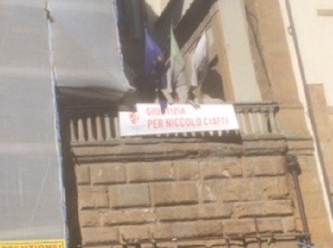 Mentre sulla terrazza della Città Metropolitana (ore 11,15) le bandiere (quella italiana molto stinta) sono issate in cima al pennone. proprio sopra lo striscione per Niccolò Ciatti.