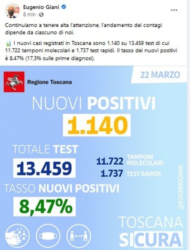 FIRENZE – Giani anticipa su Facebook i dati, tasso ancora alto: «Continuiamo a tenere alta l’attenzione, l’andamento dei contagi dipende da ciascuno di noi. I nuovi casi registrati in Toscana sono 1.140 su 13.459 test di cui 11.722 tamponi molecolari e 1.737 test rapidi. Il tasso dei nuovi positivi è 8,47% (17,3% sulle prime diagnosi)».