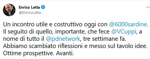 ROMA – Enrico Letta ha ritwittato il messaggio postato dalla Sardine su Twitter: Incontro positivo basato sul riconoscimento reciproco in un clima di apertura e dialogo costruttivo. La strada è lunga e accidentata, un sorriso non è tutto, ma è comunque un buon inizio, si legge nel tweet a commento della foto della riunione da remoto