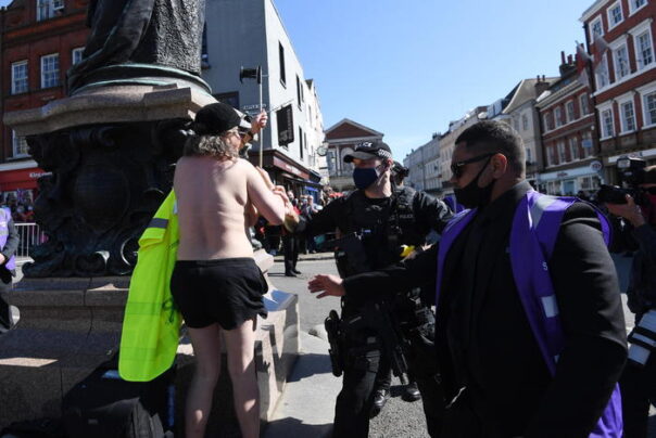 ROMA- Una manifestante ambientalista ha corso in topless davanti ad una piccola folla fuori dal castello di Windsor subito dopo il minuto di silenzio in onore del duca di Edimburgo. Lo riporta il Guardian. Salviamo il pianeta, ha urlato l’attivista saltando sopra la statua della regina Vittoria prima di essere portata via dalla polizia.