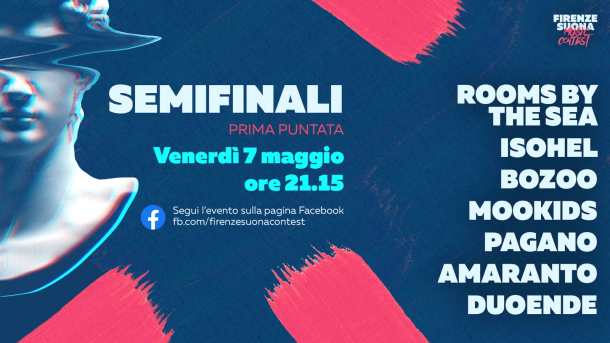 Venerdì 7 maggio ore 21.15: Presenta Elisa Giobbi (Presidente Firenze Suona), affiancata dai futuri produttori dei vincitori: Finaz (Bandabardò) e Francesco “Fry” Moneti (Modena City Ramblers). In gara: Rooms by the Sea, folk rock band formata da due ragazze e due ragazzi fiorentini, cantano in inglese e hanno creatività e personalità da vendere – Isohel, talentuoso polistrumentista ventunenne di Carrara, canta in inglese. – Bozoo, neonato progetto eclettico e sperimentale pratese che al suo interno fonde varie influenze, dal grunge allo stoner. – Mookids, sorprendente band pisana di grande creatività, “insieme da sempre”. – Pagano, cantautore e pianista pugliese di base a Firenze. I suoi brani sono orecchiabili e ben confezionati. – Amaranto, cantante emergente veronese. Originale e coinvolgente, si accompagna con la chitarra. – Duoende, un progetto unico nel suo genere (incontro tra musica colta e musica popolare) formato da una pianista classica e un organettista. Link all’evento: https://www.facebook.com/