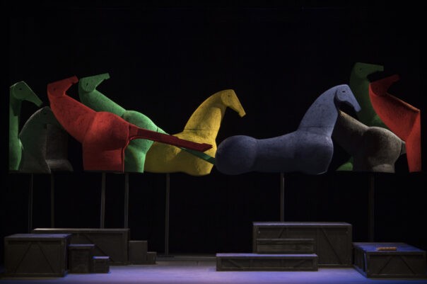 Alternando alle ottave originali di Ariosto quelle più prosaiche di Baliani, Accorsi usa la parola per suscitare stupore – la meraviglia di rinascimentale memoria – proprio come in una corte in cui il racconto nasce dall’incontro tra la fantasia di chi narra e lo stupore di chi ascolta. Sullo sfondo rimangono sempre in scena i cavalli monumentali opera dello scultore Mimmo Paladino. La guerra è la cornice della narrazione, ma l’orrore delle uccisioni si svela solo alla fine con il terribile duello tra i più forti guerrieri di una parte e dell’altra. Lo scontro sanguinoso avviene sull’isola di Lampedusa e non può mancare un riferimento a chi sulle rive e a quelle latitudini continua a morire anche oggi, come al tempo di Carlo Magno vi morirono il re saraceno Agramante e il paladino Brandimarte.