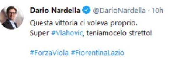 FIRENZE – Nardella esulta per la Viola. «Questa vittoria ci voleva proprio. Vlahovic superlativo. Teniamocelo stretto!». Lo ha scritto sul suo profilo Twitter il sindaco di Firenze, Dario Nardella, commentando il successo gigliato di questa sera ai danni della Lazio, usando l’hashtag #forzaviola.