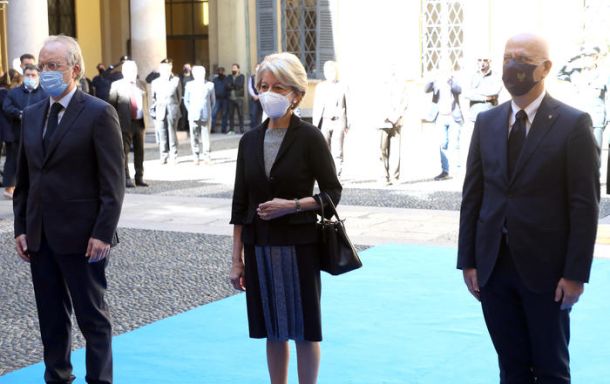 Da sinistra: Il prefetto di Milano Renato Saccone, la vedova del commissario Calabresi Gemma Capra e il questore Giuseppe Petronzi, in occasione della commemorazione del commissario Calabresi ucciso 49 anni fa. Milano 17 Maggio 2021.