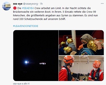 ROMA – Nuovo soccorso in mare per la Sea Eye 4. Nella notte la nave ha salvato altre 99 persone, la maggior parte delle quali afferma di provenire dalla Siria. A renderlo noto la stessa Ong, sottolineando che ora ci sono circa 330 rifugiati sulla nostra nave. L’equipaggio di Sea Eye 4 sta lavorando al limite, si legge su Twitter. E ovviamente chiederà porto sicuro all’Italia che, come al solito calerà le brache. E accoglieremo, a nostre spese e pericolo, altri 330 clandestini per volere delle Ong.