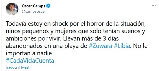 ROMA – Open Arms scopre vergogna. «Sono ancora sotto shock per l’orrore della situazione, bambini piccoli e donne che avevano solo sogni e ambizioni di vita. Sono stati abbandonati su una spiaggia a Zuwara in Libia per più di 3 giorni. A nessuno importa di loro». A scriverlo su Twitter è Oscar Camps, il fondatore della Ong spagnola Oscar Camps, postando le foto shock di corpi senza vita di bimbi riversi su una spiaggia del Paese nordafricano, vittime probabilmente dell’ennesimo naufragio. Corpi abbandonati. Vite dimenticate. L’orrore tenuto lontano perché scompaia. Vergogna Europa, scrive l’ong.
