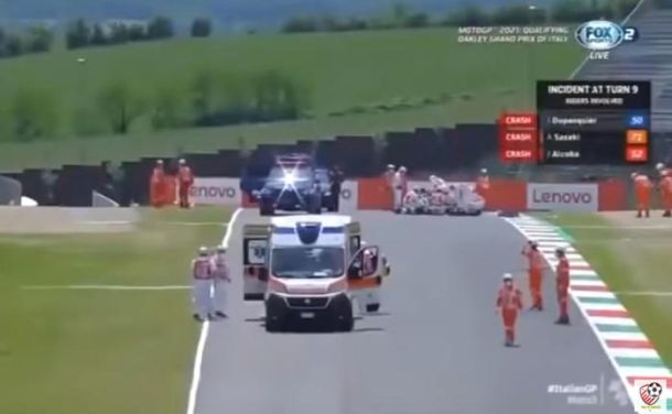 Il fermo immagine preso da Youtube mostra l’arrivo dei soccorsi dopo che il pilota svizzero Jason Dupasquier, della Ktm, e’ stato coinvolto in una caduta multipla insieme a Jeremy Alcoba (Honda) e Ayumu Sasaki (Ktm) durante le prove ufficiali del Gran Premio del Mugello della Moto 3