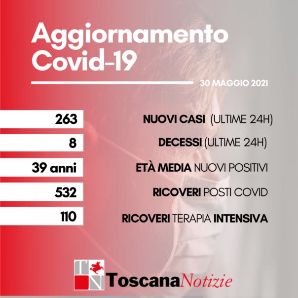 FIRENZE – Sono 8 i morti per coronavirus di oggi, 30 maggio 2021, in Toscana. E 263 i nuovi contagiati. E 263 sono i nuovo contagiati (252 confermati con tampone molecolare e 11 da test rapido antigenico) con età media di 39 anni (26% ha meno di 20 anni, 24% tra 20 e 39 anni, 33% tra 40 e 59 anni, 12% tra 60 e 79 anni, 5% ha 80 anni o più). In totale da inizio pandemia, i positivi toscani sono 241.275.