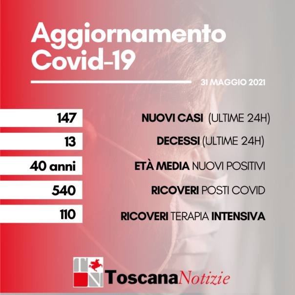 Coronavirus in Toscana: 13 morti (età media 77 anni), oggi 31 maggio. E 147 nuovi contagi