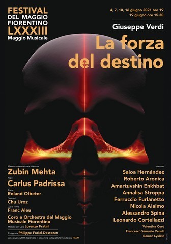 «La forza del destino». Melodramma in quattro atti di Francesco Maria Piave [e Antonio Ghislanzoni]. Musica di Giuseppe Verdi (Versione 1869). Edizione: Edwin Kalmus &Co., Inc., Boca Raton, Florida. Nuovo allestimento. Coro e Orchestra del Maggio Musicale Fiorentino. Maestro concertatore e direttore Zubin Mehta, Maestro del Coro Lorenzo Fratini. Cast: Il Marchese di Calatrava Alessandro Spina, Donna Leonora, figlia del marchese Saioa Hernández, Don Carlo di Vargas [Lo Studente], figlio del marchese Amartuvshin Enkhbat, Don Alvaro Roberto Aronica, Preziosilla, giovane zingara Annalisa Stroppa, Padre Guardiano, francescano Ferruccio Furlanetto, Fra Melitone, francescano Nicola Alaimo, Curra, cameriera di Leonora Valentina Corò, Mastro Trabuco, mulattiere, poi rivendugliolo Leonardo Cortellazzi, Un Alcade Francesco Samuele Venuti, Un Chirurgo, militare spagnolo Roman Lyulkin. Solisti del Coro Ferruccio Finetti, Leonardo Melani, Luca Tamani. Figuranti speciali Elena Barsotti, Maria Diletta Della Martira, Maria Novella Della Martira, Sara Silli, Giampaolo Gobbi, Emanuele Marchetti, Alessio Nieddu, Gaetano Tizzano