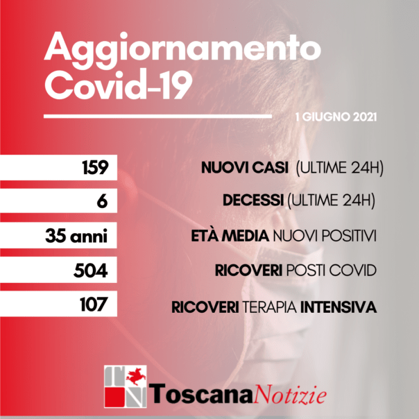 FIRENZE – Sono in calo i morti per coronavirus, anche in Toscana: ma ogni vita perduta rappresenta una sconfitta e un dolore per tutti. Oggi, 1 giugno 2021, se ne sono andati 3 uomini e 3 donne con età media di 80 anni. E scende sensibilmente anche il numero dei nuovi contagiati: 159 (152 confermati con tampone molecolare e 7 da test rapido antigenico) con età media di 35 anni (30% ha meno di 20 anni, 28% tra 20 e 39 anni, 30% tra 40 e 59 anni, 10% tra 60 e 79 anni, 2% ha 80 anni o più).