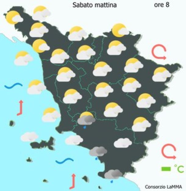 SABATO 5 giugno . Stato del cielo e fenomeni: nuvoloso con possibilità di locali rovesci in mattinata, schiarite dal pomeriggio in particolare a partire dalla costa.