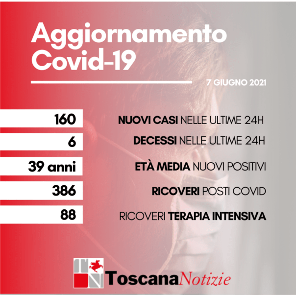 FIRENZE – Sono 6 i morti per coronavis in Toscana, oggi 7 giugno 2021. Si tratta di 4 uomini e 2 donne con età media di 75 anni. Sono invece 160 i nuovi contagiati: 156 confermati con tampone molecolare e 4 da test rapido antigenico. L’età media dei 160 nuovi positivi odierni è di 39 anni (19% ha meno di 20 anni, 30% tra 20 e 39 anni, 37% tra 40 e 59 anni, 11% tra 60 e 79 anni, 3% ha 80 anni o più). In totale i positivi toscani da inizio pandemia sono 242.569.