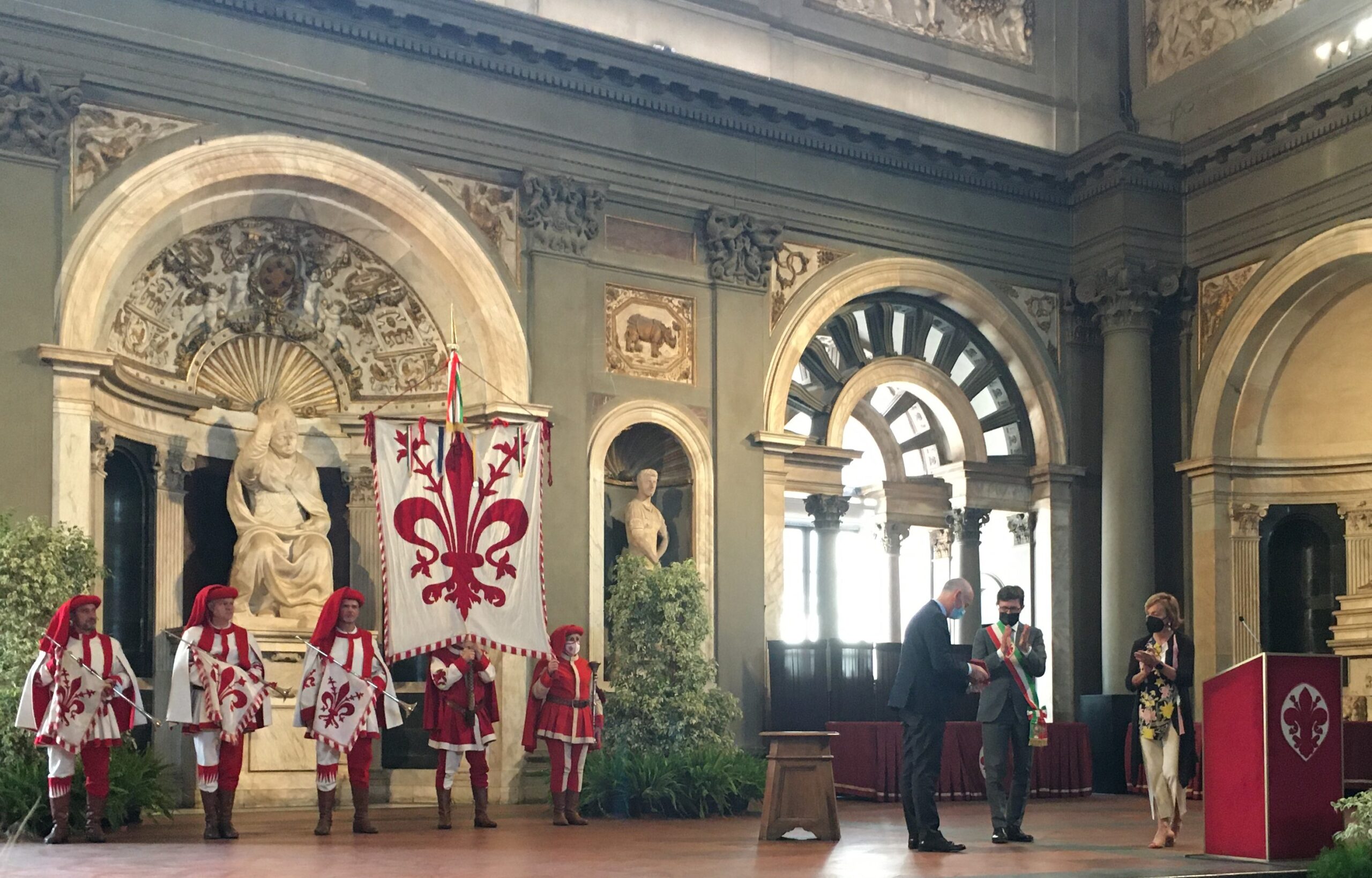 FIRENZE – In Palazzo Vecchio consegna del fiorino d’oro al prefetto Franco Gabrielli, già Capo della Polizia e attuale Sottosegretario alla Presidenza del Consiglio.  Al saluto del Sindaco è seguito il ringraziamento di Gabrielli, che ha riassunto  il suo spaccato di carriera alla questura fiorentina negli anni ‘90, in particolare come funzionario all’antiterrorismo, sopèrattutto per l’attentato di via dei Georgofili. La consegna da parte mani del Sindaco, affiancato dal prefetto Alessandra Guidi, al suono delle chiarine della Famiglia di Palazzo.