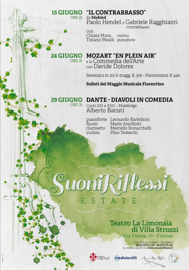 FIRENZE – Riprende con la rassegna Suoni Riflessi Estate l’attività di Suoni Riflessi, l’associazione musicale che ci ha abituato alle più disinvolte e accattivanti contaminazioni fra le arti. Stavolta produce tre spettacoli particolarmente adatti per il clima estivo e informale del teatro all’aperto della Limonaia di Villa Strozzi, meraviglioso parco cittadino che merita di essere conosciuto e apprezzato per la sua bellezza esaltata dalla costruzione di Giuseppe Poggi rivisitata da Giovanni Michelucci. I tre concerti-spettacolo, che si terranno alle 21, inizieranno martedì 15 giugno con la lettura sarcastica e divertente di Paolo Hendel di stralci del monologo di Suskind “Il Contrabbasso”, che vedrà Gabriele Ragghianti interprete e spalla al grande strumento, assieme alla partecipazione di Tiziano Melli (pianoforte) e Chiara Mura (violino). Attraverso Il Contrabbasso e le sue divagazioni psicodrammatiche vi si legge la metafora divertente e paradossale di chi non riesce e realizzare le sue ambizioni. Le musiche, neanche a dirlo focalizzate sul contrabbasso, sono di Bach, Bottesini, Garcia, Paganini, Saint-Saens.
