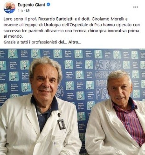 E continua sulla pagina Facebook, visitando l’ospedale di Pisa: «Loro sono il prof. Riccardo Bartoletti e il dott. Girolamo Morelli e insieme all’equipe di Urologia dell’Ospedale di Pisa hanno operato con successo tre pazienti attraverso una tecnica chirurgica innovativa prima al mondo. Grazie a tutti i professionisti della sanita’ toscana, continueremo a investire per cure sempre piu’ moderne e all’avanguardia!”. Lo ha scritto sul suo profilo Facebook il presidente della regione Toscana, Eugenio Giani, allegando una foto del professor Riccardo Bartoletti e del dottor Girolamo Morelli.