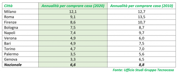 Effettuando un confronto a distanza di dieci anni, si evince che a livello nazionale la differenza è stata consistente: infatti si è passati dalle 8,8 annualità nel 2010 alle 6,6 del 2020. In questo lasso temporale per comprare casa a Roma occorrono 4,4 annualità in meno, a Milano 0,6 annualità in meno a conferma del fatto che a Milano, negli ultimi anni, i valori immobiliari stanno riprendendosi. La tabella qui sotto è significativa.