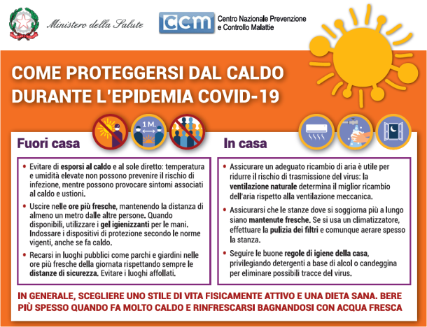 Quest’anno il Ministero della salute, oltre il dacalogo, ha anche elaborato l’infografica ‘Come proteggersi dal caldo durante l’epidemia Covid-19’.