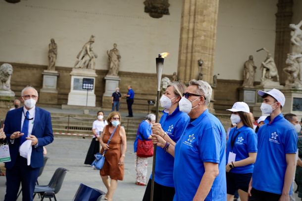 Gianni De Magistris e Svetlana Korytova hanno acceso il braciere in Piazza della Signoria durante la cerimonia d’inizio delle Olimpiadi condotta dalla bravissima Carlotta Comparini.
