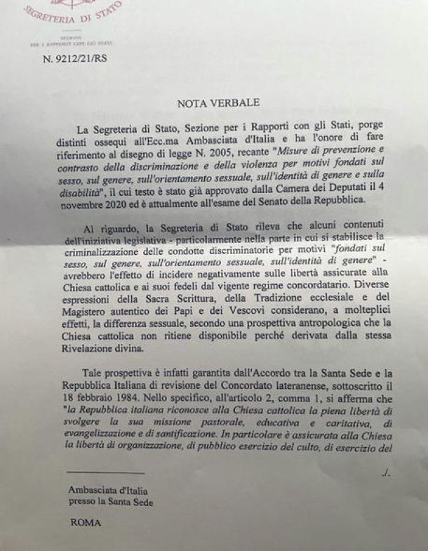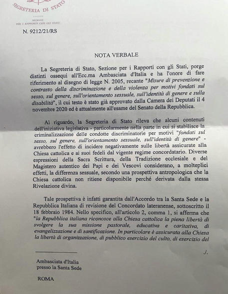 Nella nota verbale sul ddl Zan indirizzata il 17 giugno dalla segreteria di Stato vaticana all’ambasciata d’Italia presso la Santa sede si leggeva: «La segreteria di Stato rileva che alcuni contenuti dell’iniziativa legislativa del ddl Zan, particolarmente nella parte in cui si stabilisce la criminalizzazione delle condotte discriminatorie per motivi ‘fondati sul sesso, sul genere, sull’orientamento sessuale, sull’identità di genere’ – avrebbero l’effetto di incidere negativamente sulle libertà assicurate alla Chiesa cattolica e ai suoi fedeli dal vigente regime concordatario. Ci sono espressioni della Sacra Scrittura e delle tradizioni ecclesiastiche del magistero autentico del Papa e dei vescovi, che considerano la differenza sessuale, secondo una prospettiva antropologica che la Chiesa cattolica non ritiene disponibile perché derivata dalla stessa Rivelazione divina. Tale prospettiva – prosegue la nota verbale – è infatti garantita dall’Accordo tra la Santa Sede e la Repubblica italiana di Revisione del concordato lateranense, sottoscritto il 18 febbraio 1984».