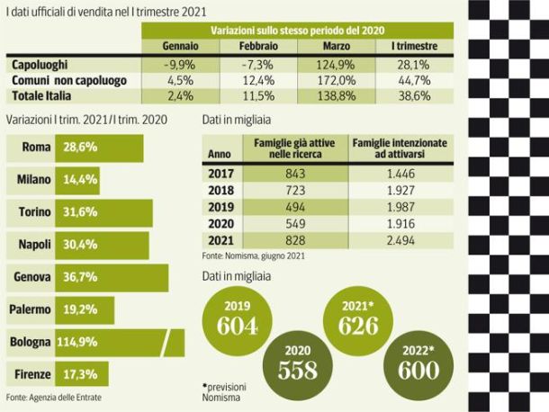 I dati finora disponibili sulla prima metà del 2021 indicano un incremento delle transazioni, non solo come è ovvio rispetto ai periodi del lockdown duro del 2020, ma anche rispetto al pre-pandemia. Con una differenza non da poco rispetto al passato: l’investimento oggi nella maggior parte dei casi non è spinto dal desiderio di trarre un guadagno finanziario, quanto da quello di un guadagno di benessere familiare e personale; e così si cercano case con spazi più grandi o anche seconde case da sfruttare per lunghi periodi.