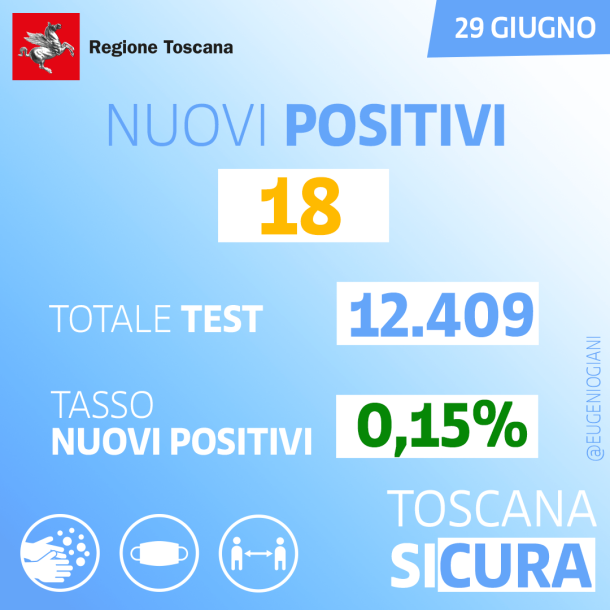 FIRENZE – Sono 18 i nuovi casi di Coronavirus registrati nelle 24 ore in Toscana, oggi 29 giugno 2021, su 12.409 test di cui 5.976 tamponi molecolari e 6.443 test rapidi. Il tasso dei nuovi positivi è 0,15% (0,4% sulle prime diagnosi). Lo scrive il presidente della Regione Eugenio Giani sui social spiegando che non si registrano nuovi casi nelle persone con più di 65 anni.
