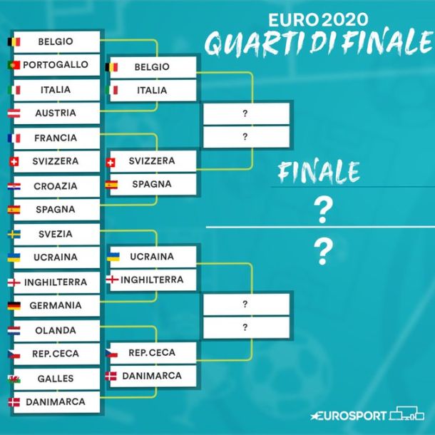 ROMA – Messi in archivio gli ottavi di finale con le sorprese dell’eliminazione, meritatissima, della Francia, della Germania e dell’Olanda, l’Italia, vittoriosa contro l’Austria, nei quarti di finale dovrà affrontare il Belgio, vittorioso per 1-0 contro il Portogallo. L’altro quarto della ns parte del tabellone vede incontrarsi la Spagna e la Svizzera. Dall’altra parte del tabellone Repubblica Ceca e Danimarca si contenderanno un posto per la semifinale, mentre l’Inghilterra, vittoriosa sulla Germania, se la vedrà contro l’Ucraina di Shevchenko.