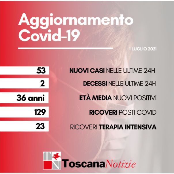 FIRENZE – Sono 2 i morti per coronavirus, oggi 1 luglio 2021, in Toscana. Si tratta di un uomo e una donna con età media di 69 anni, entrambi risiedevano a Firenze. In Toscana sono 244.327 i casi di positività al Coronavirus, 53 quelli registrati oggi (52 confermati con tampone molecolare e 1 da test rapido antigenico) con età media di 36 anni (25% ha meno di 20 anni, 28% tra 20 e 39 anni, 43% tra 40 e 59 anni, 2% tra 60 e 79 anni, 2% ha 80 anni o più)..