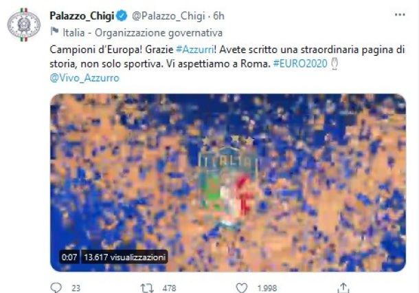 Si adegua anche Palazzo Chigi: Campioni d’Europa! Grazie azzurri! Avete scritto una straordinaria pagina di storia, non solo sportiva. Vi aspettiamo a Roma”. Cosi’, su Twitter, Palazzo Chigi ha commentato la finale di questa sera di Euro2020.
