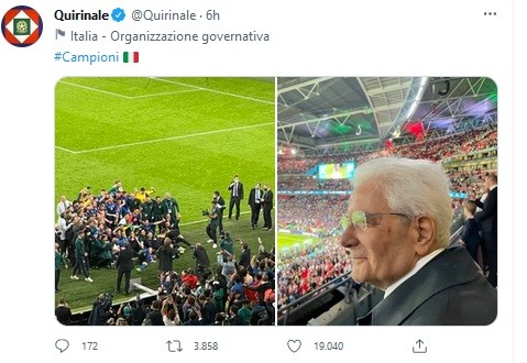 Campioni”. Cosi’, su Twitter,il Quirinale ha commentato la finale di questa sera di Euro2020. A corredo due foto: gli azzurri in festa in una e il presidente Sergio Mattarella sorridente nell’altra.