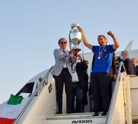 ROMA – Una notte corta. E l’arrivo di mattina presto, poco dopo le 6 di oggi, 12 luglio 2021, a Fiumicino. Un boato quando Mancini e Chiellini sono apparsi in cima alle scalette dell’aereo a Fiumicino. È quello tributato dalle decine di operatori aeroportuali che si sono radunati sotto il velivolo con applausi e cori. Il più scatenato Bonucci, che ha intonato «I campioni dell’Europa siamo noi».