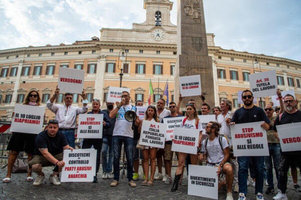 Alcuni momenti della manifestazione dei gestori delle discoteche in Piazza Montecitorio. Roma 8 Luglio 2021 ANSA/VALERIO PORTELLI